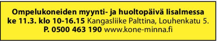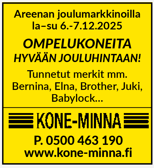 Kone-Minna osallistuu useamman kerran vuodessa eri tapahtumiin, joissa voi tutustua laadukkaisiin koneisiimme. Ohesta löydät tietoa tapahtumista, joissa Kone-Minna on mukana esittelemässä ompelukoneitaan. Tule tutustumaan valikoimaamme!